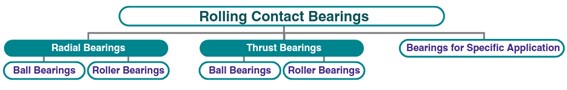 In general, rolling contact bearings may be classified as radial or thrust bearings according to bearing design or they may be classified as ball or roller bearings according to the type of rolling element. Radial bearings are mainly designed for supporting a load perpendicular to a shaft axis, whereas thrust bearings accept loads parallel to the shaft axis. Using the BALL and ROLLER classification ROLLER bearings may be further divided according to the shape of the roller into the subclasses; Cylindrical roller, Tapered roller, Spherical roller, or Needle roller bearings. BALL bearings can be further divided according to the number of rows into either single-row or double-row (for Thrust Ball bearings, single-direction and double-direction.) BALL Bearing may be still further sub-divided into smaller segments according to the relationship between the bearing rings and rolling elements; the shape of bearing rings; and use of accessories. Bearings are also classified by specific application, such as Clutch-release ball bearings for automotive applications. Table 1.1 indicates the principal types of radial and thrust bearings and a summary of their design. Table 1.2 summarizes the designs and features of rolling contact bearings.